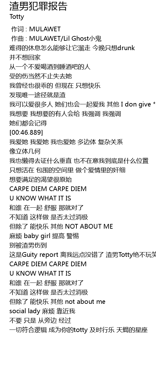 | [01:17.136] | 这是Guity report 离我远点没错了 渣男Totty绝不玩笑 |