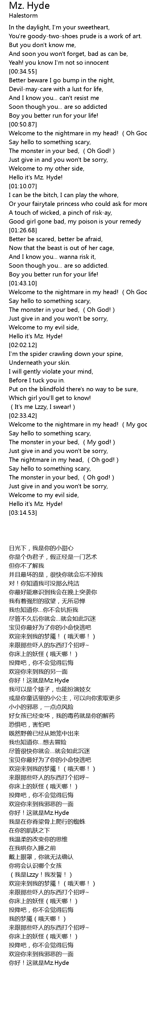 | [02:00.71] | Hello it' s Mz. Hyde! |