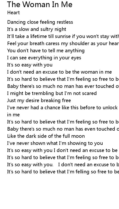 | It' s so hard to believe that I' m feeling so free to be the woman in me | |