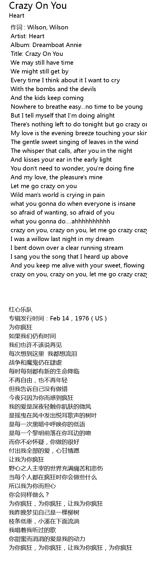 | [03:20.100] | crazy on you, crazy on you, let me go crazy crazy on you.... |