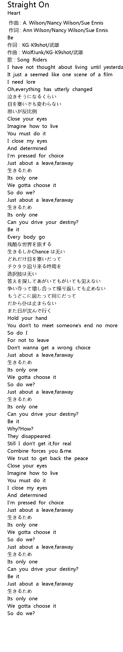 | [00:00.697] | 作词 : Ann Wilson/Nancy Wilson/Sue Ennis |