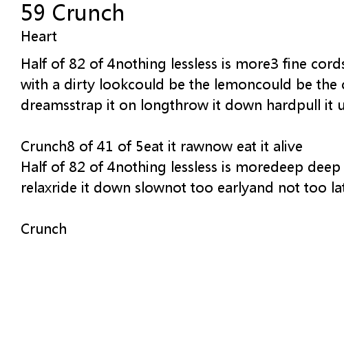 | Half of 82 of 4nothing lessless is more3 fine cordsone sharp hookgot a shouter with a dirty lookcould be the lemoncould be the creamtasty tastyin your dreamsstrap it on longthrow it down hardpull it up tight with that crazy 5 bar59 | |