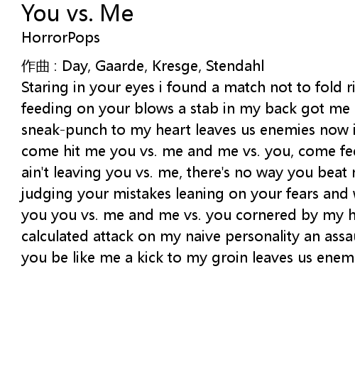 | Staring in your eyes i found a match not to fold riding the first round out, i' m feeding on your blows a stab in my back got me bleeding on your honesty a sneakpunch to my heart leaves us enemies now it' s you vs. me and me vs. you, come hit me you vs. me and me vs. you, come feed me me vs. you and you vs. me i ain' t leaving you vs. me, there' s no way you beat me baby mainlining hate and judging your mistakes leaning on your fears and whispering in your ears i got you you vs. me and me vs. you cornered by my hopes you invade my dignity a calculated attack on my naive personality an assault on my place doesn' t make you be like me a kick to my groin leaves us enemies |
