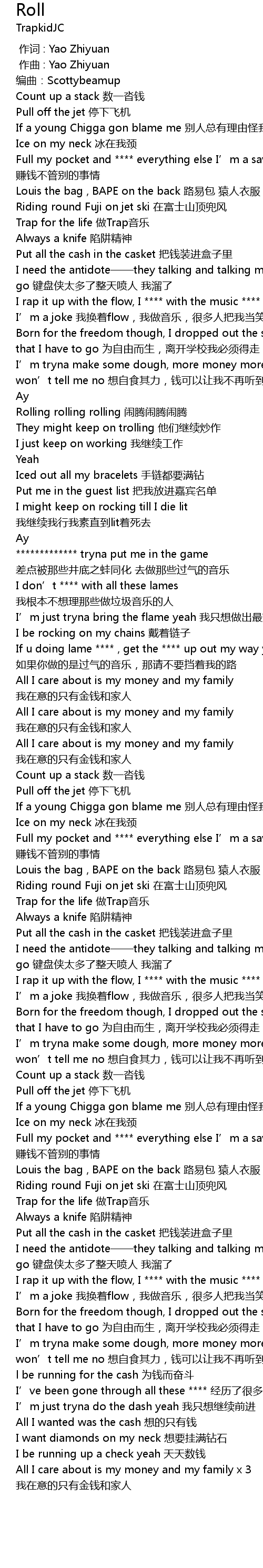 | [00:35.434] | I' m tryna make some dough, more money more power these people won' t tell me no xiang zi shi qi li, qian ke yi rang wo bu zai ting dao" bu" |