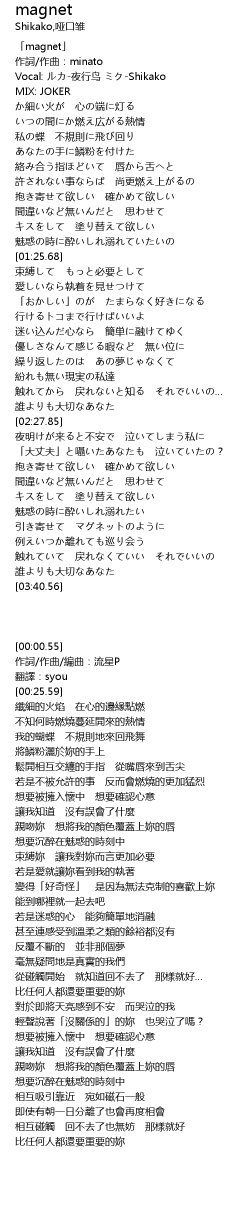 | [00:18.92] | Vocal: ルカ-夜行鸟 ミク-Shikako |