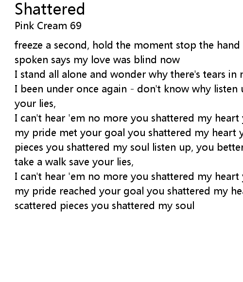 I can't hear 'em no more you shattered my heart you shattered my soul shattered my pride reached your goal you shattered my heart you shattered my soul scattered pieces you shattered my soul |