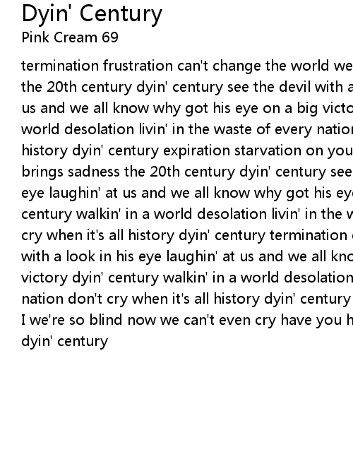 termination frustration can't change the world we see turn daylight to darkness the 20th century dyin' century see the devil with a look in his eye laughin' at us and we all know why got his eye on a big victory dyin' century walkin' in a world desolation livin' in the waste of every nation don't cry when it's all history dyin' century expiration starvation on your prime time tv pure madness brings sadness the 20th century dyin' century see the devil with a look in his eye laughin' at us and we all know why got his eye on a big victory dyin' century walkin' in a world desolation livin' in the waste of every nation don't cry when it's all history dyin' century termination expiration see the devil with a look in his eye laughin' at us and we all know why got his eye on a big victory dyin' century walkin' in a world desolation livin' in the waste of every nation don't cry when it's all history dyin' century now the devil is you and