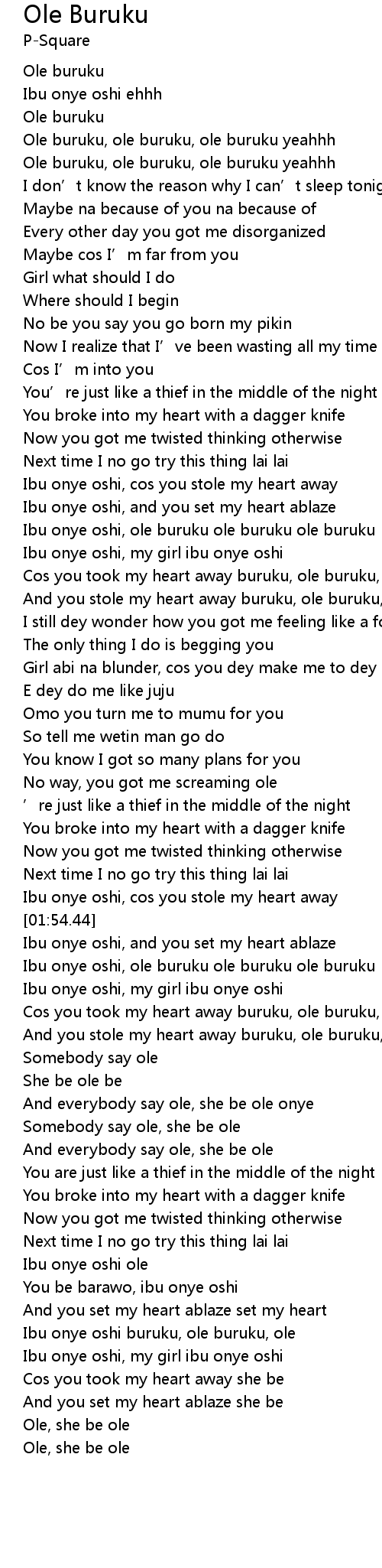 | [01:09.73] | Cos you took my heart away buruku, ole buruku, ole |