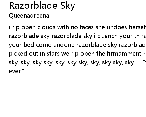 | i rip open clouds with no faces she undoes herself for a slice of your pie razorblade sky razorblade sky i quench your thirst i bleed you dry help you make your bed come undone razorblade sky razorblade sky identifying marks our history picked out in stars we rip open the firmamment razorblade sky razorblade sky sky, sky, sky sky, sky, sky sky, sky, sky sky, sky..... "forever and ever and ever." |