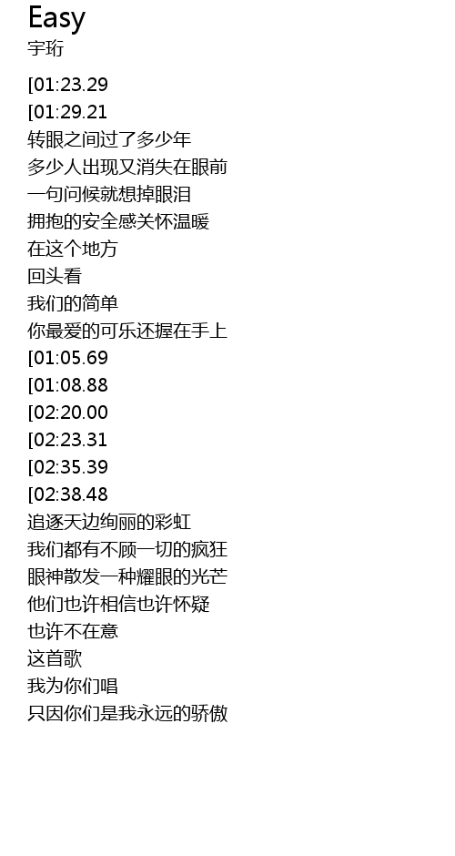 | [00:09.00][01:23.29][03:13.02] | 宇恒-Easy |