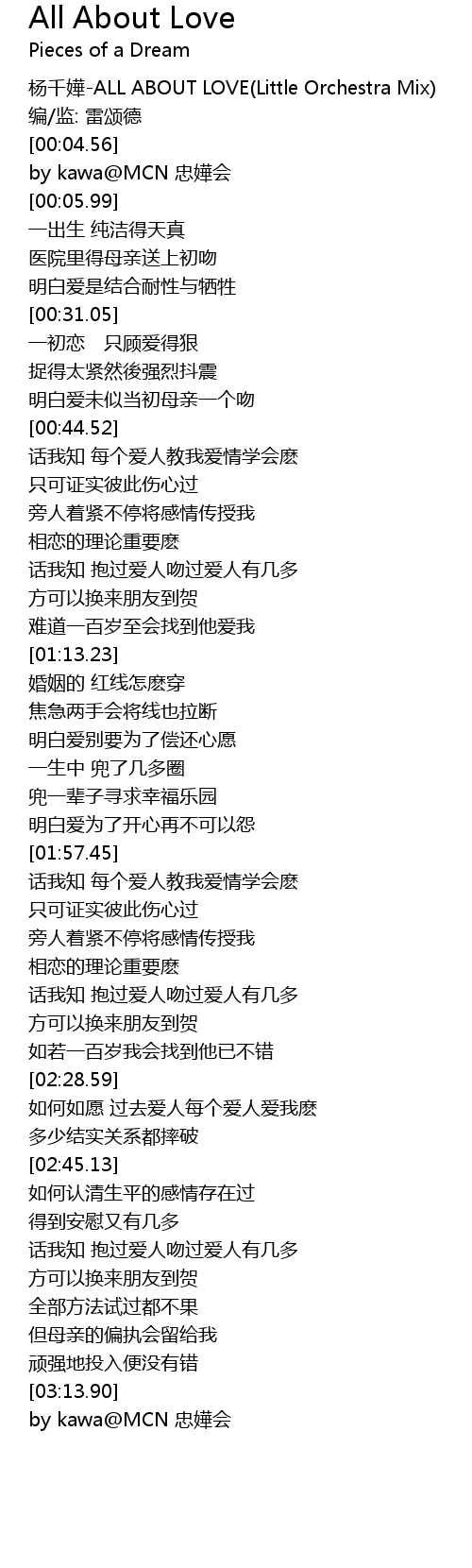 | [00:03.26] | yáng qiān huà ALL ABOUT LOVE Little Orchestra Mix |