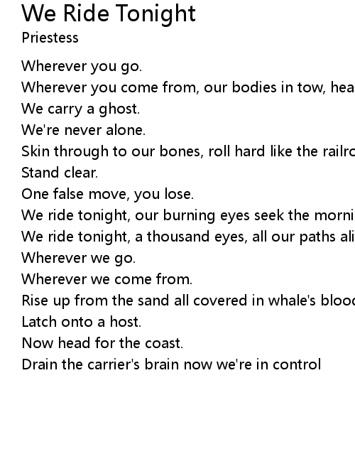 We ride tonight, a thousand eyes, all our paths aligned we ride tonight. |