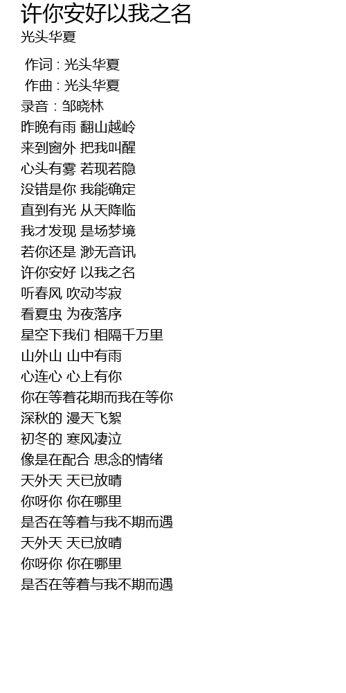 | [01:08.695] | xǔ nǐ ān hǎo yǐ wǒ zhī míng |