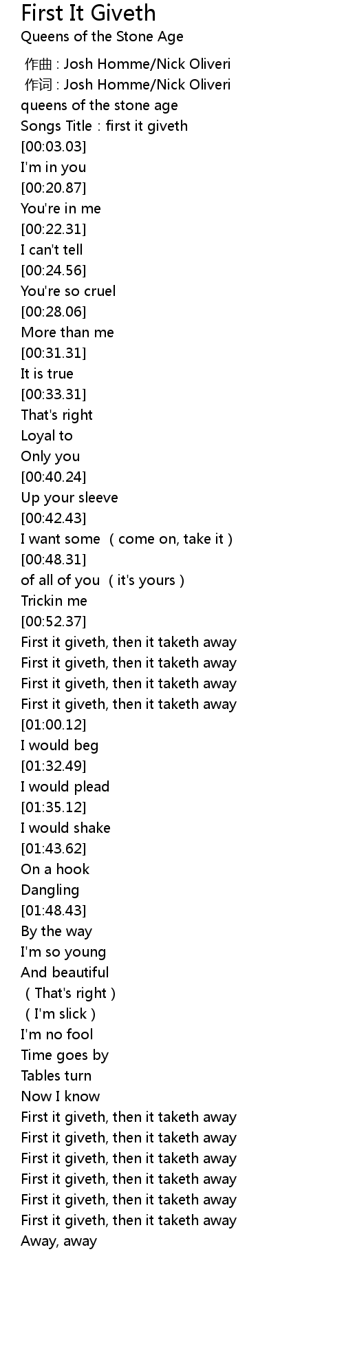 | [00:56.75] | First it giveth, then it taketh away |