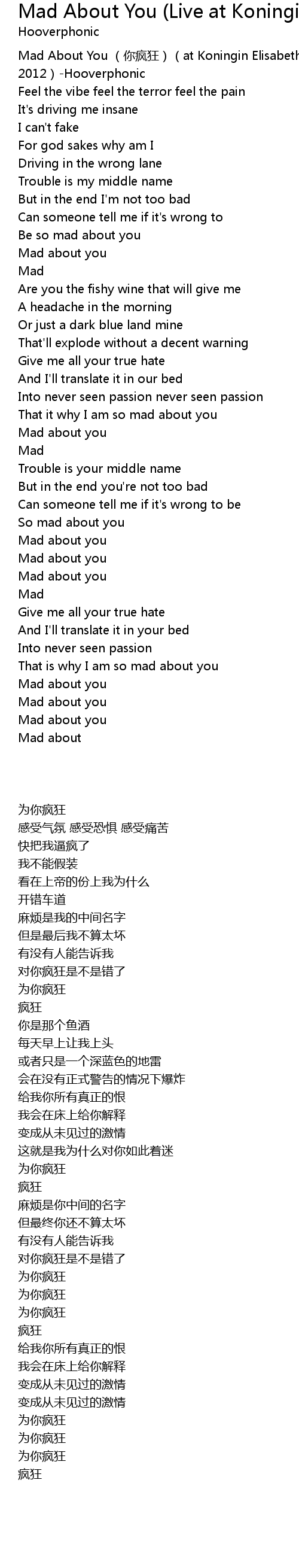 | [00:00.00] | Mad About You (你疯狂)(at Koningin Elisabethzaal 2012)-Hooverphonic |