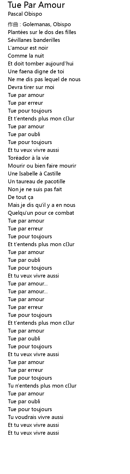 | Song | Tue Par Amour |