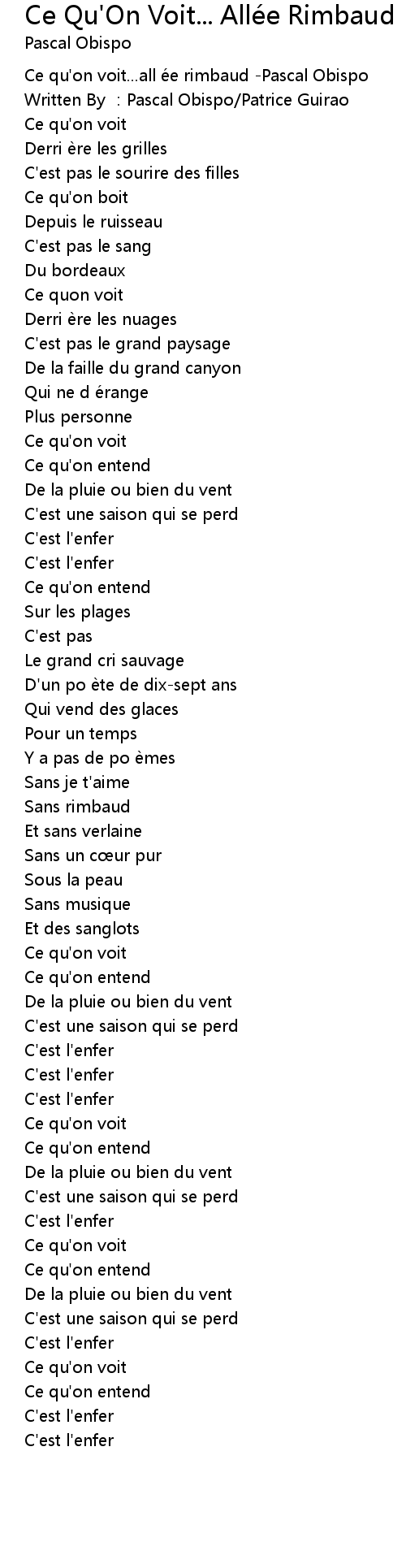 | [00:00.280] | Ce qu' on voit... all é e rimbaud Pascal Obispo |