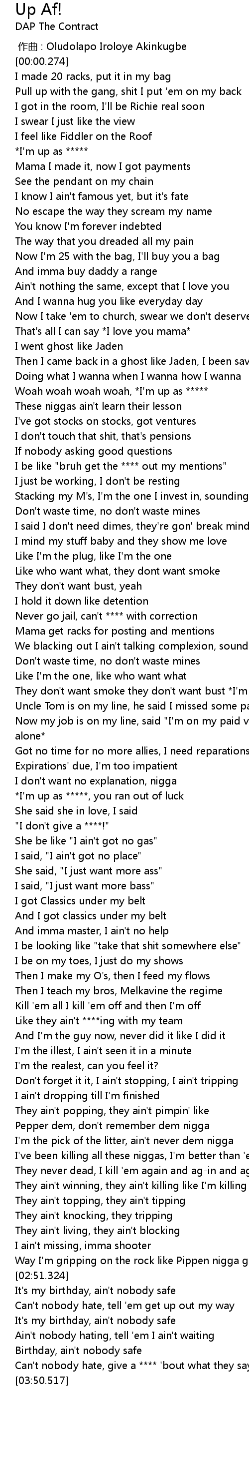 | [00:58.788] | Woah woah woah woah, *I'm up as ***** |