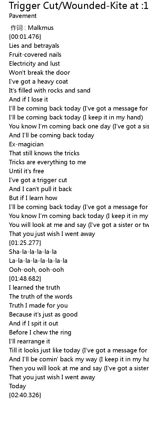 | [00:41.652] | You know I'm coming back one day (I've got a sister or two) |