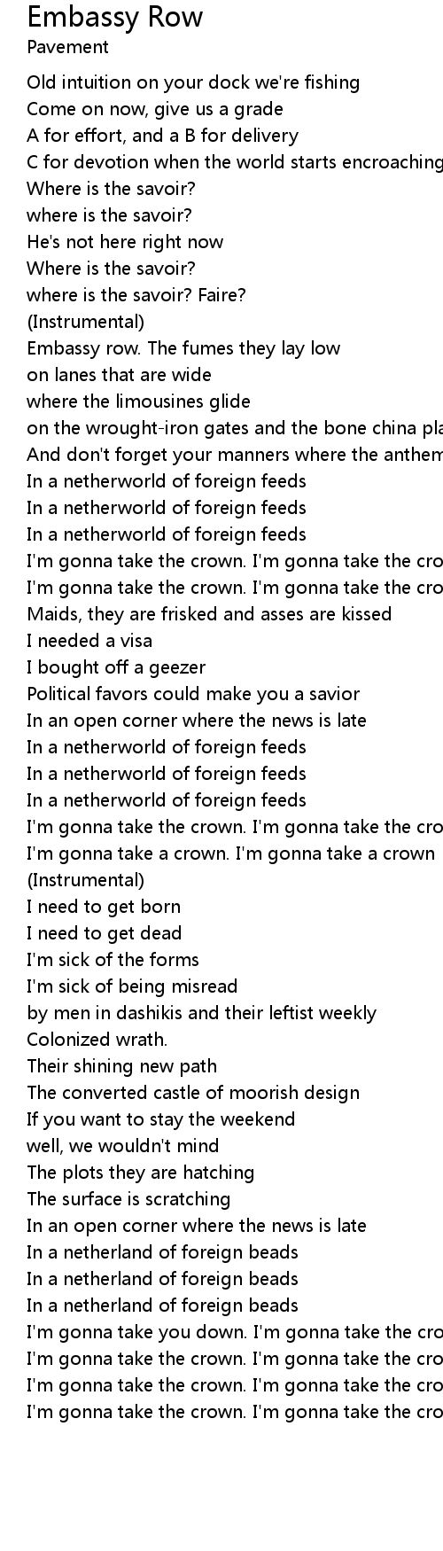 Embassy row. The fumes they lay low |