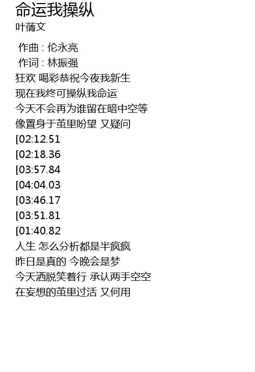 | [00:43.56] | xiàn zài wǒ zhōng kě cāo zòng wǒ mìng yùn |