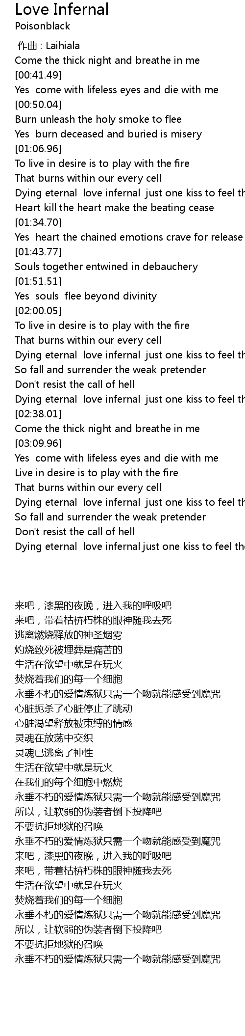 | [02:10.92] | Dying eternal love infernal just one kiss to feel the spell |