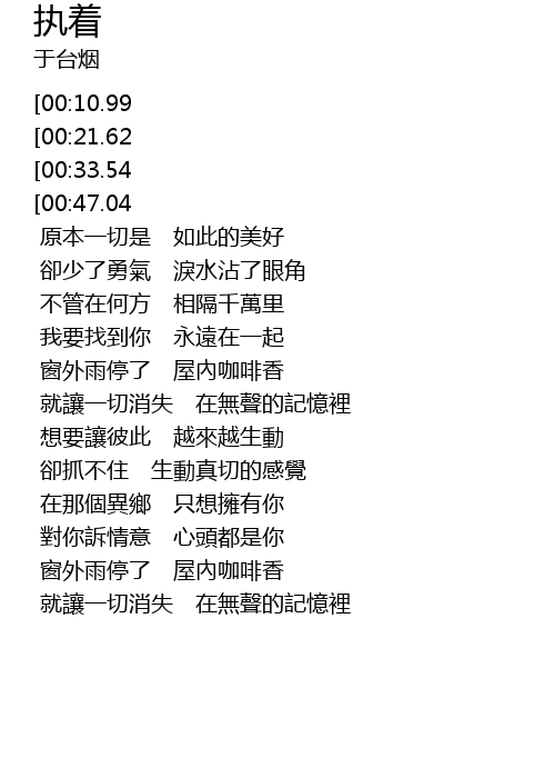 | [02:40.71][00:33.54] | 大雨打醒了夢 咖啡依舊香 |