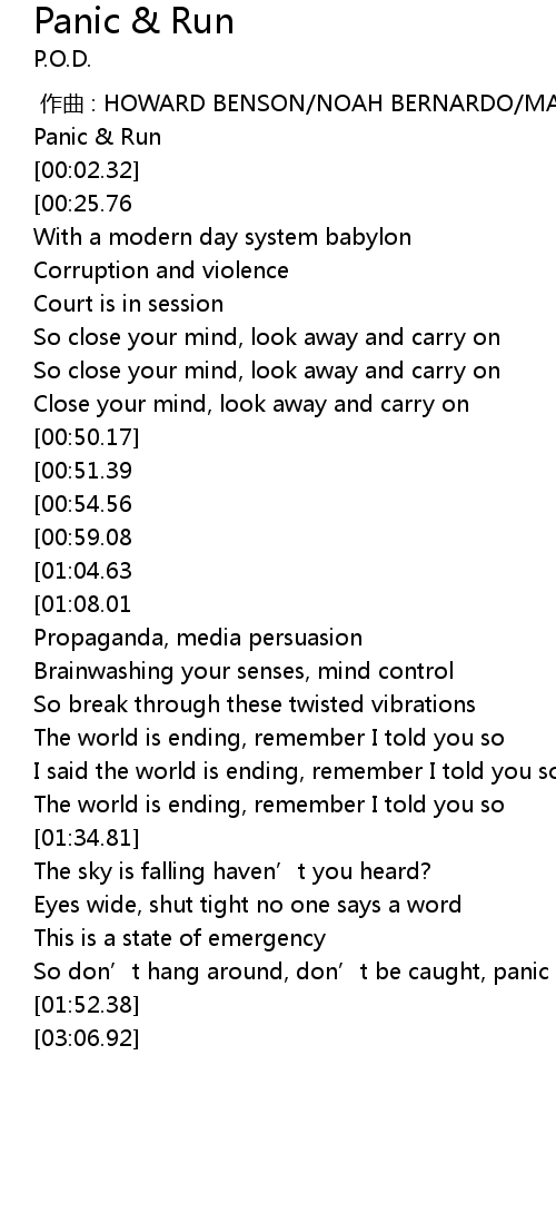 | [02:57.79][01:04.63] | So don' t hang around, don' t be caught, panic and run |