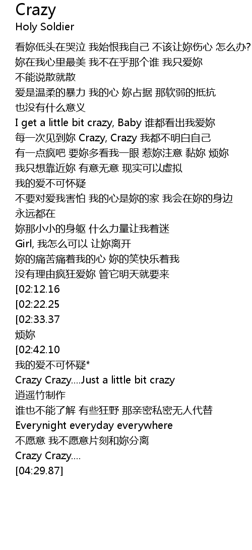 | [02:57.59] | Crazy Crazy....Just a little bit crazy |