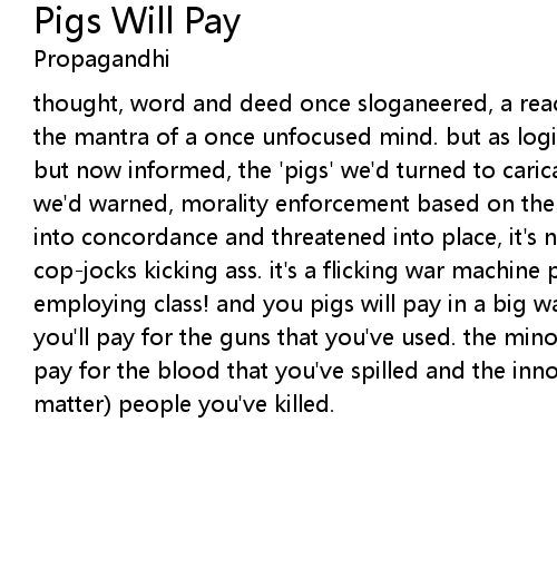 thought, word and deed once sloganeered, a reaction undefined, the battle-hymn, the mantra of a once unfocused mind. but as logic tempered anger, still inspired but now informed, the 'pigs' we'd turned to caricature became far worse than we'd warned, morality enforcement based on the interests of a state, coerced into concordance and threatened into place, it's not just isolated incidents of cop-jocks kicking ass. it's a flicking war machine protecting the wealth of the employing class! and you pigs will pay in a big way. what a stupid thing to say. you'll pay for the guns that you've used. the minorities you've abused, you'll pay for the blood that you've spilled and the innocent (or 'guilty', for that matter) people you've killed. |