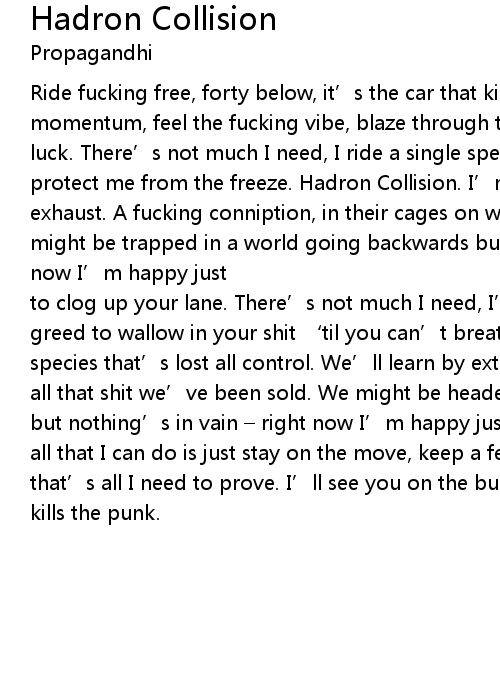 | Ride fucking free, forty below, it' s the car that kills the punk. Pedal for momentum, feel the fucking vibe, blaze through traffic, burn the red, push my luck. There' s not much I need, I ride a single speed, my toque and mitts protect me from the freeze. Hadron Collision. I' m ripping through a cloud of exhaust. A fucking conniption, in their cages on wheels they fucking rot. I might be trapped in a world going backwards but nothing' s in vain right now I' m happy just | |