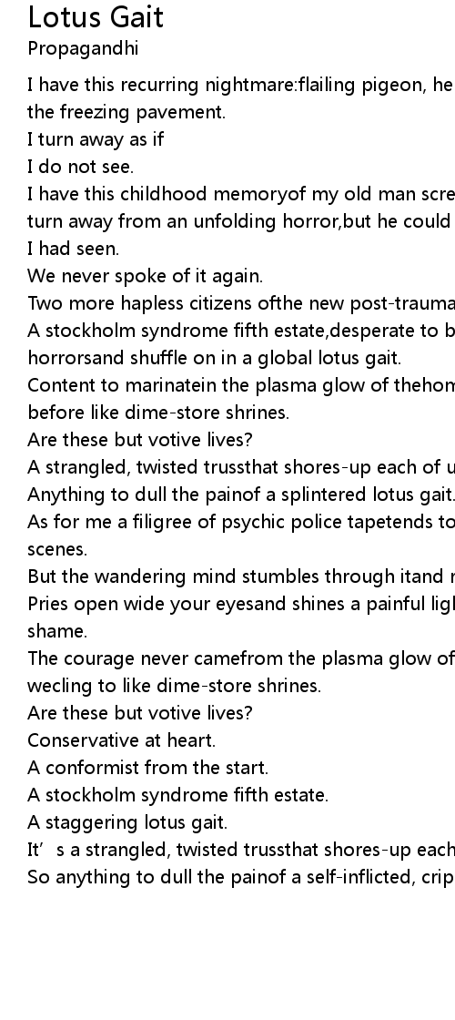 | A stockholm syndrome fifth estate,desperate to batten down the mounting horrorsand shuffle on in a global lotus gait. | |