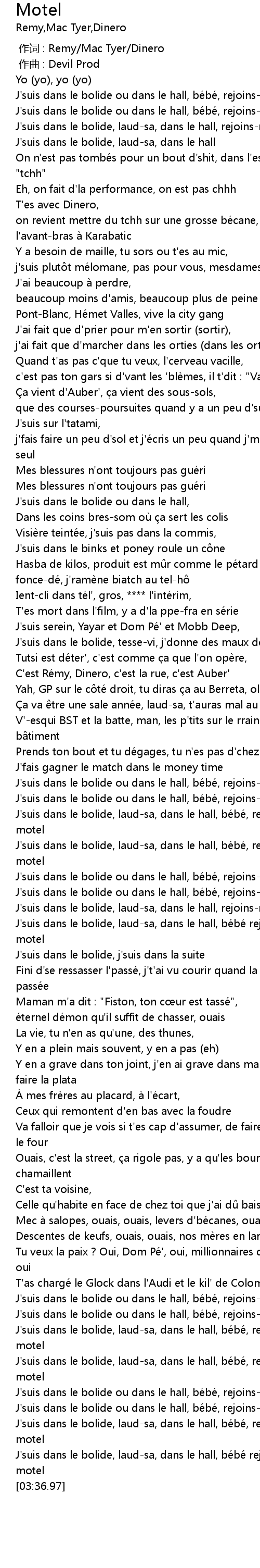 | [03:32.69] | J' suis dans le bolide, laudsa, dans le hall, be be rejoinsmoi au motel |