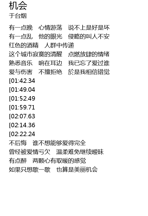 | [02:44.96][01:42.34] | 陌生人在说 你不该喝醉 |