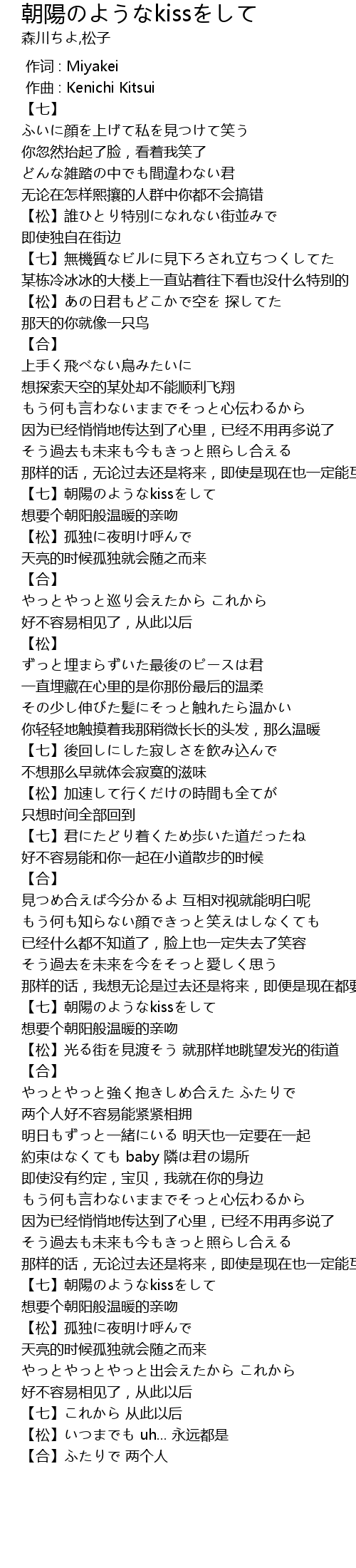 | [02:43.000] | 【七】朝陽のようなkissをして 想要个朝阳般温暖的亲吻 |