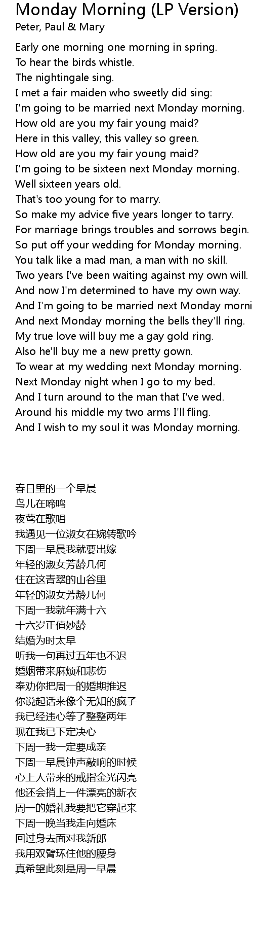 And next Monday morning the bells they'll ring. |