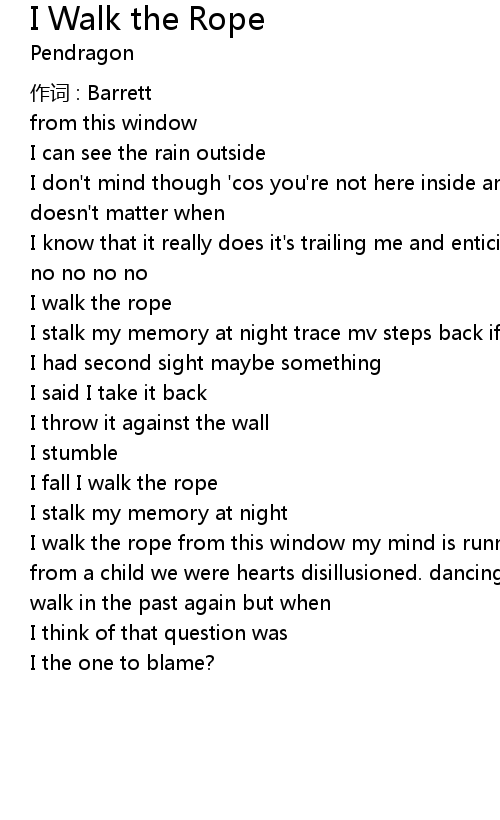 | I walk the rope from this window my mind is running wild feels like a toy stolen from a child we were hearts disillusioned. dancing in the rain maybe we could walk in the past again but when | |