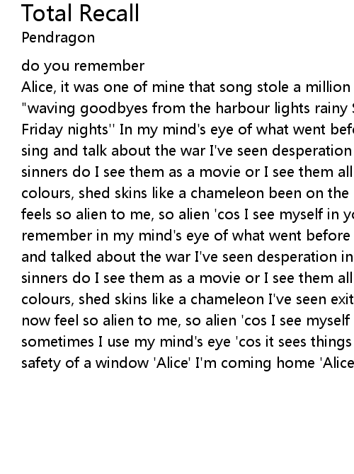 Alice, it was one of mine that song stole a million hearts. a million times "waving goodbyes from the harbour lights rainy Sunday afternoons. enchanted Friday nights'' In my mind's eye of what went before In old pubs they used to sing and talk about the war I've seen desperation in the streets. side step the sinners do I see them as a movie or I see them all as mirrors? I've been through colours, shed skins like a chameleon been on the edge of darkness which now feels so alien to me, so alien 'cos I see myself in you and you in me I still remember in my mind's eye of what went before In old dance halls where they sang and talked about the war I've seen desperation in the streets. side step the sinners do I see them as a movie or I see them all as mirrors? I've been through colours, shed skins like a chameleon I've seen exit signs on rocky roads which now feel so alien to me, so alien 'cos I see myself in you and you in me sometimes I use my mind's eye 'cos it sees things I don't want through the safety of a window 'Alice' I'm coming home 'Alice' I'm coming home |