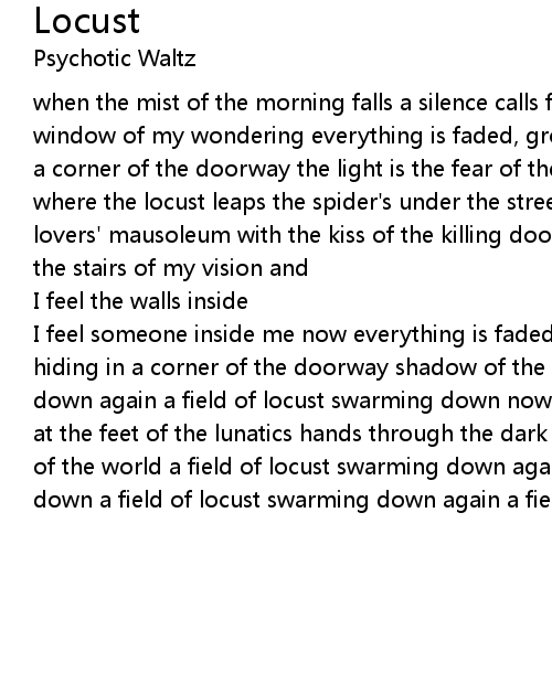 | I feel someone inside me now everything is faded, growing near to the ground hiding in a corner of the doorway shadow of the world a field of locust swarming down again a field of locust swarming down now the jackals of the nightmare lay at the feet of the lunatics hands through the dark are crawling over me shadow of the world a field of locust swarming down again a field of locust swarming down a field of locust swarming down again a field of locust swarming down |