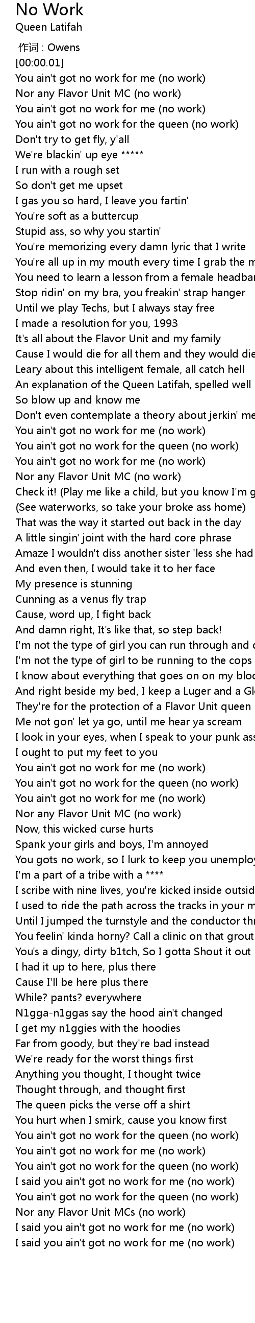 | [01:42.60] | You ain't got no work for the queen (no work) |