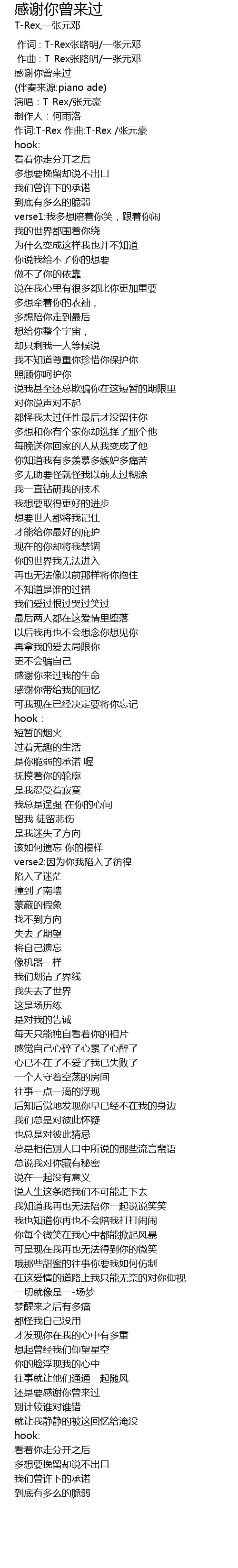 | [00:00.000] | 作词 : T-Rex张路明/一张元邓 |