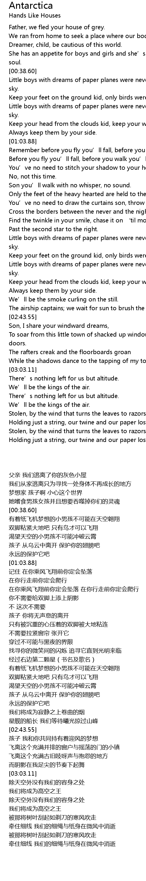 | [02:16.46] | Little boys with dreams of paper planes were never meant to scrape the sky. |