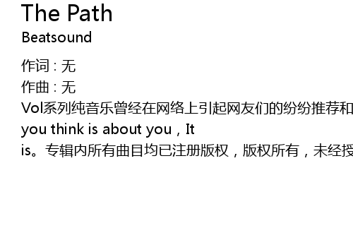 Vol系列纯音乐曾经在网络上引起网友们的纷纷推荐和好评,这一次Beatsound又将这张珍藏多年的《Vol.4》发布至此,If you think is about you,It is。专辑内所有曲目均已注册版权,版权所有,未经授权禁止使用,如有使用需求请联系本人。