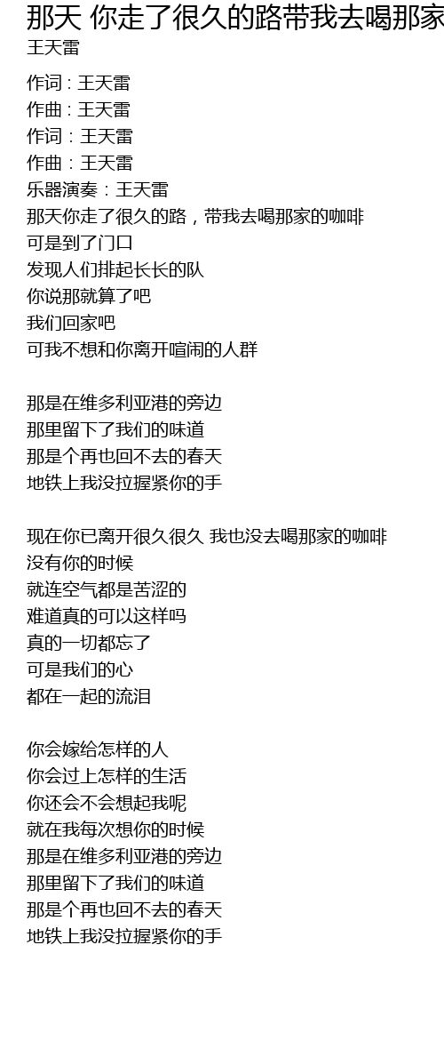| nà tiān nǐ zǒu le hěn jiǔ de lù, dài wǒ qù hē nà jiā de kā fēi | |