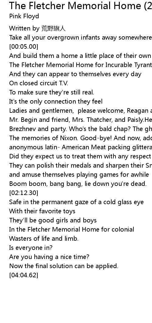 | [00:24.67] | The Fletcher Memorial Home for Incurable Tyrants and Kings. |