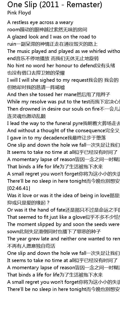 | [02:31.01] | A momentary lapse of reason jie yin yi nian zhi jian yi shi hu tu |
