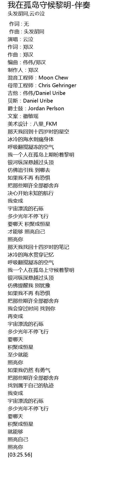 | [00:20.27] | 我一个人在孤岛上期盼着黎明 |