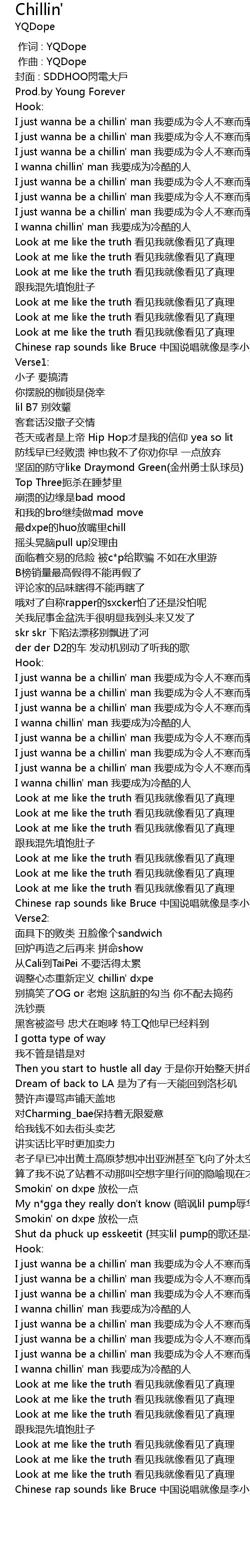 | [03:23.580] | I just wanna be a chillin' man wǒ yào chéng wéi lìng rén bù hán ér lì de rén |