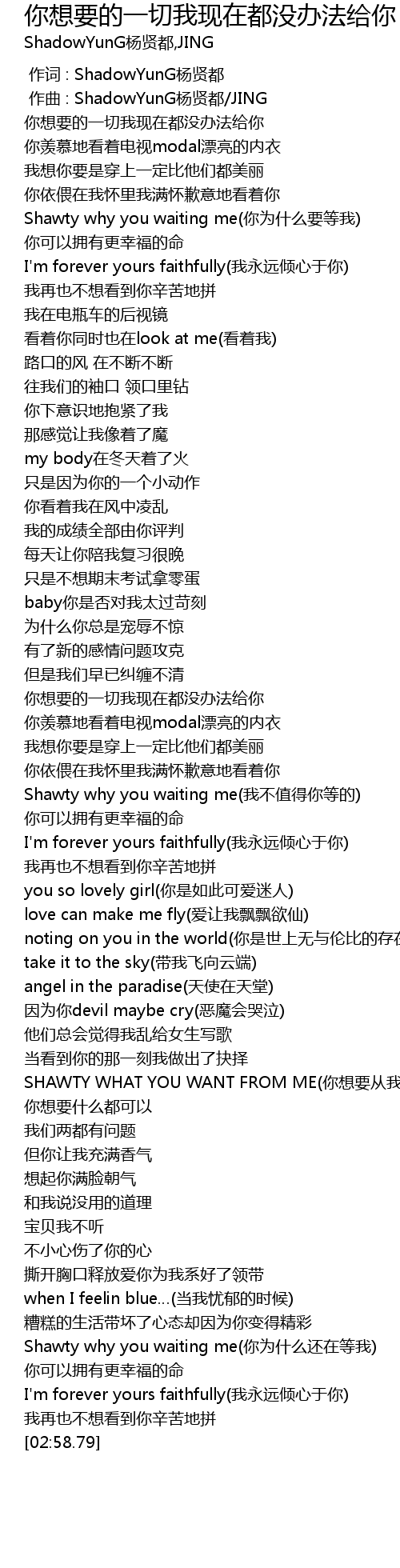 | [02:11.58] | SHAWTY WHAT YOU WANT FROM ME ni xiang yao cong wo zhe li de dao shen me |