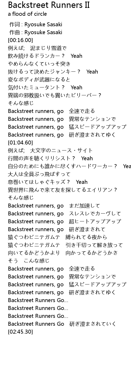 | [00:58.95] | Backstreet runners, go 研ぎ澄まされてゆく |